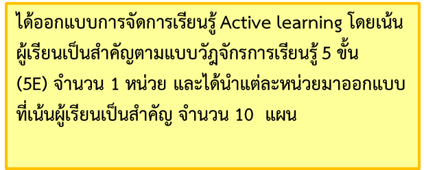 - ข้าพเจ้านําความรู้ความ สามารถ ทักษะที่ได้จากการพัฒนาตนเองและวิชาชีพมา ออกแบบแผนจัดการเรียนรู้ได้ ในรายวิชาที่สอนได้แก่วิชาเคมี ระดับชั้นมัธยมศึกษาปีที่ 5 และ 6